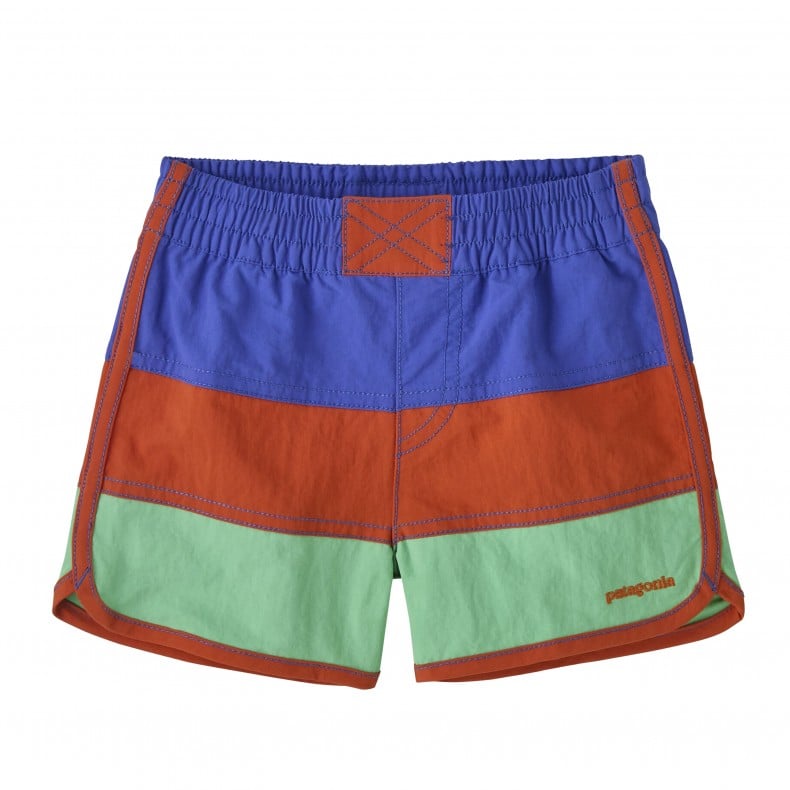 The fun, color-blocked, baby-sized boardshorts are crafted of quick-drying NetPlus® 100% postconsumer recycled nylon faille made from recycled fishing nets to help reduce ocean plastic pollution, and treated with a durable water repellent (DWR) finish made without intentionally added PFAS, for comfort in and out of the water. They have a soft elasticized waistband for easy on/off. Inseam is 5cm (2").