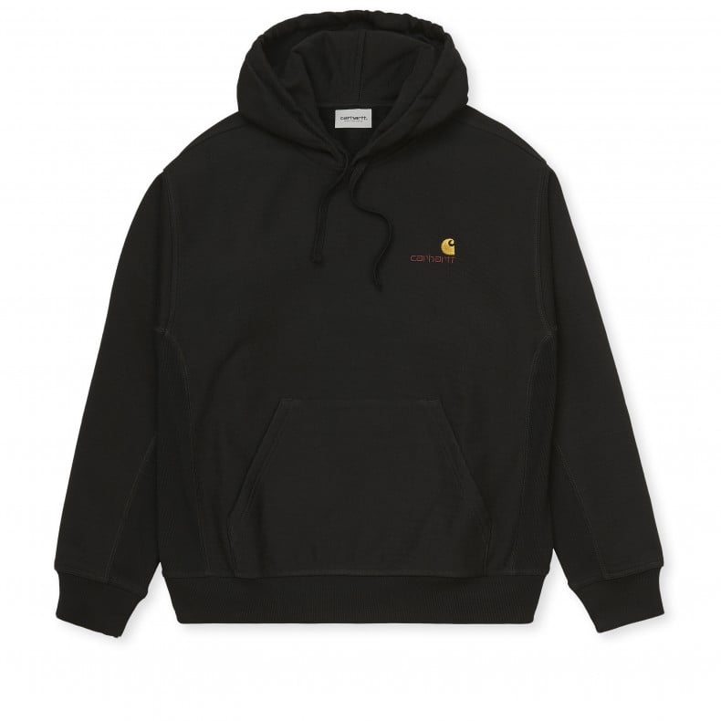 Boxy fit men's Carhartt WIP American Script Pullover Hooded Sweatshirt; in a black soft brushed cotton/poly jersey, with an adjustable hood, kangaroo pocket, ribbed waist, and cuffs, set-in sleeves, a straight hem and featuring an embroidered gold and maroon Carhartt American Script on the left side of the chest.