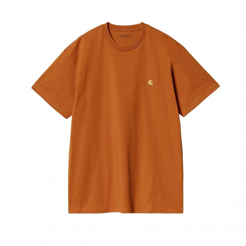 Loose fit men's Carhartt Work in Progress Chase Tee; in an orange mid-weight combed cotton jersey, with a ribbed neck, set-in sleeves, straight hem, and featuring a small gold Carhartt WIP Chase left side chest embroidered logo.