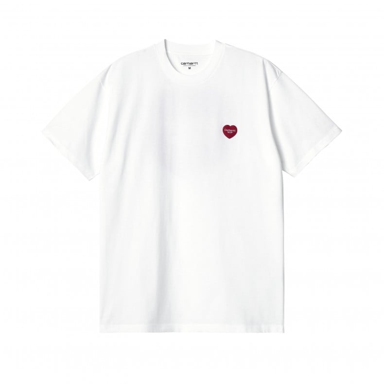 Loose fit men's Carhartt Work In Progress Double Heart Tee; in a white light organic cotton jersey, with a ribbed neck, set-in sleeves, straight hem, and featuring a red tonal heart Carhartt WIP graphic back print and an embroidered patch on the chest.