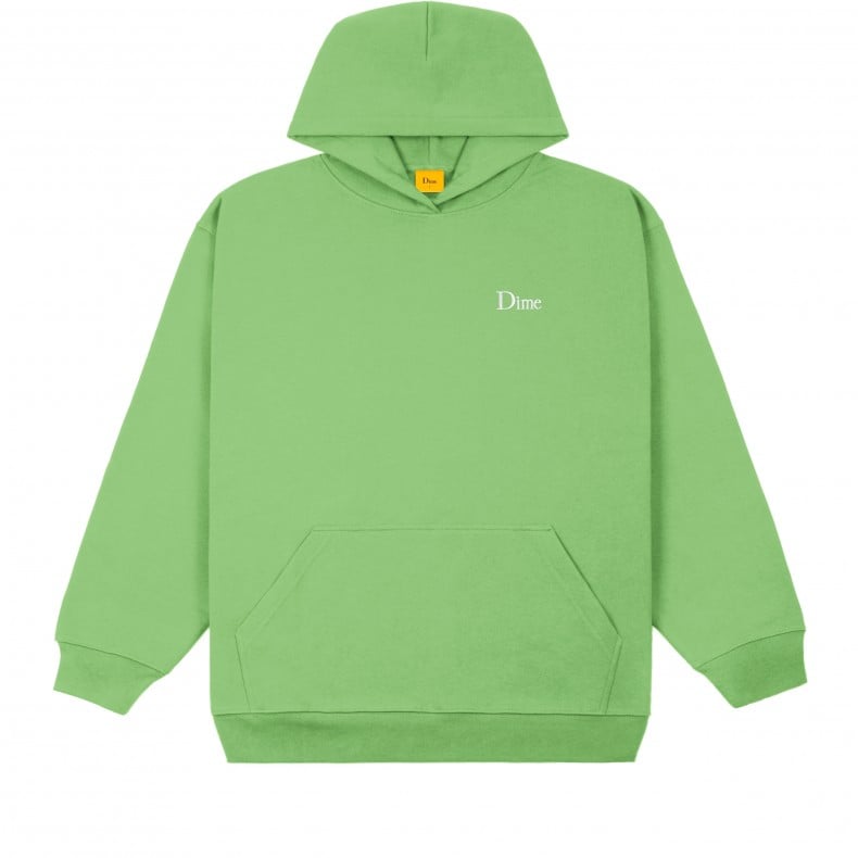 Regular fit men's Dime Classic Small Logo Embroidered Pullover Hooded Sweatshirt; in a Tea Green fleece back cotton jersey, with a jersey-lined hood, set-in sleeves, ribbed cuffs and waist, front pocket with double side entry, and featuring a white Dime classic logo left side chest embroidery.