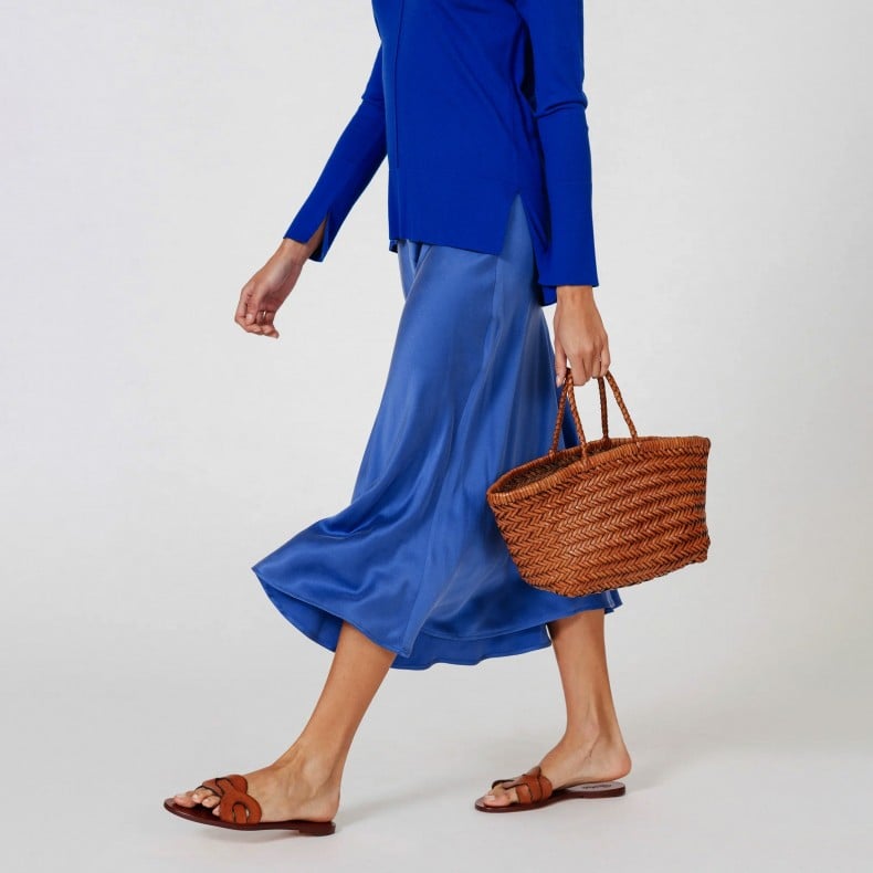 This is the iconic Dragon Diffusion bag, and it remains their bestseller today—a roomy, hand-woven basket in smooth, buffalo calf leather. Handcrafted by their artisan weavers in one piece, the diagonal chevron weave is what makes this style unique. And, remaining true to traditional basket weaving techniques, the bag comes unlined with an open top.