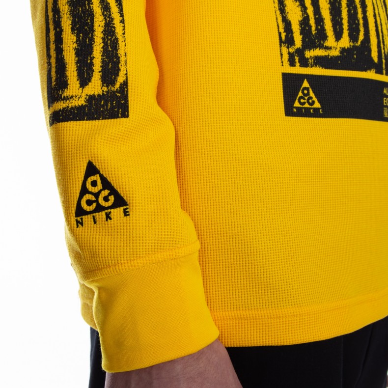 Standard fit men's Nike ACG Long Sleeve Waffle Long Sleeve T-Shirt, in a Amarillo Yellow mid-weight waffle jersey, with a ribbed neck, set-in sleeves, ribbed cuffs, straight hem and featuring a black Nike ACG NRG front print, sleeve prints and a Nike ACG Logo sleeve embroidery.