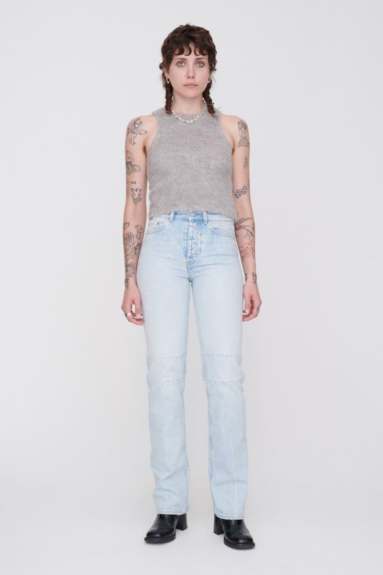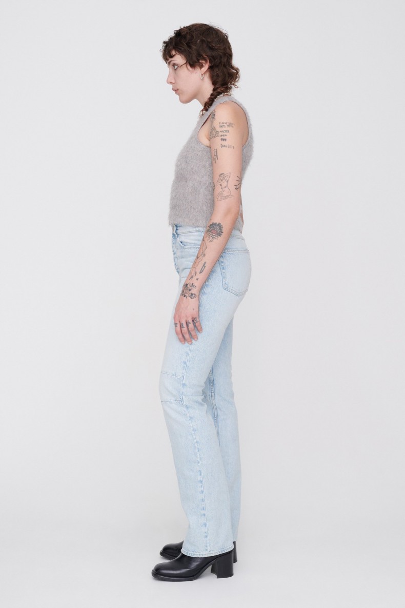 The Our Legacy Extended Linear Cut in Super Light Wash. Produced in a vintage washed Italian denim, the women's Extended Linear Cut jeans sit mid-waist, are straight fitting and feature pressed creases, stitched knee panels, five pockets, metal rivets, and a button fly.
